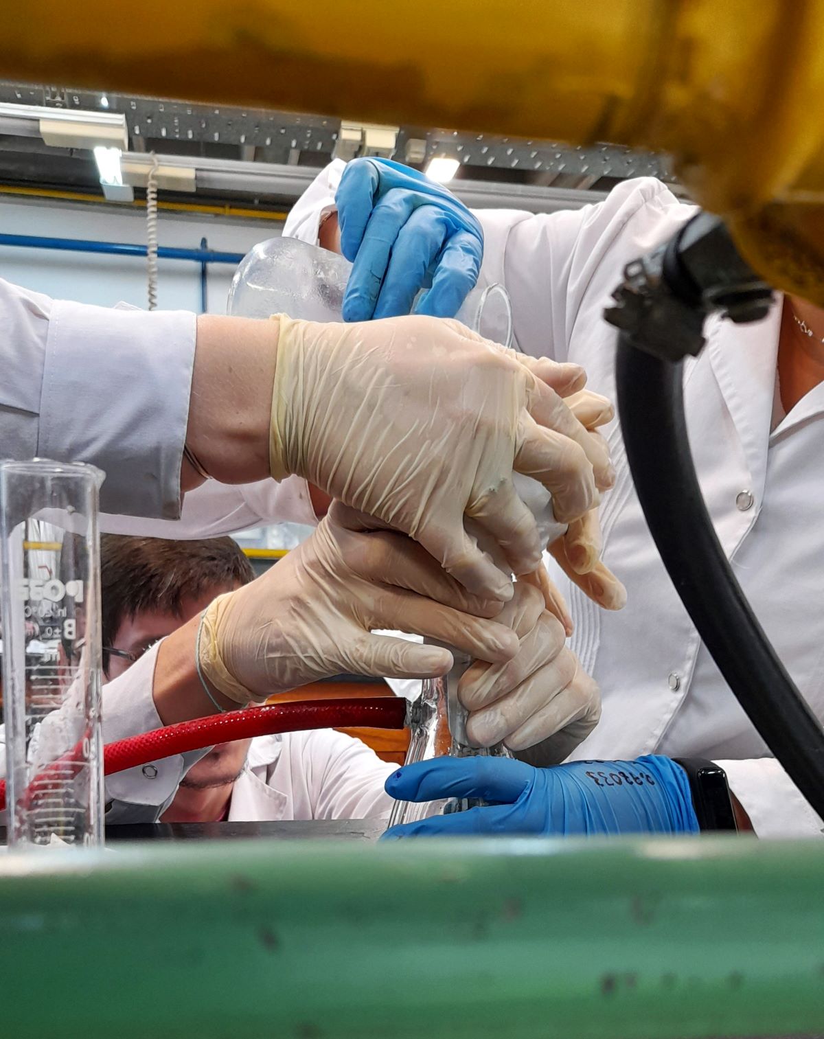 La fotografía, tomada en los laboratorios del Departamento de Química en 2024, muestra a varios compañeros unidos en una misma tarea, destacando que la cooperación es un material tan esencial como los guantes o los equipos de trabajo.